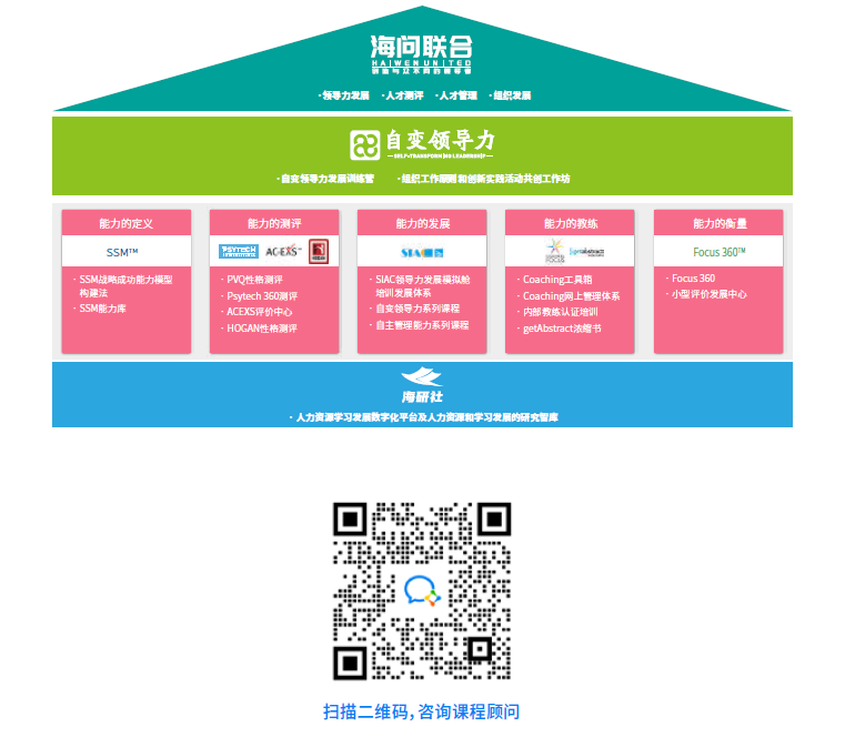 同时,基于任建平提出的“自变领导力”的概念,海问联合提供自变领导力发展、领导者心智成长,变革免疫分析、组织心智和文化构建、组织能力构建等系统纵向领导力和组织能力咨询、辅导和培养服务。