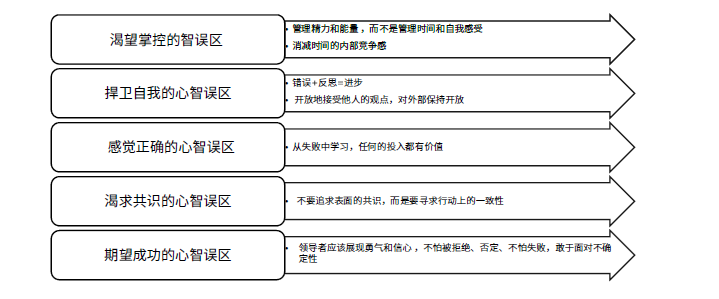 珍妮弗·加维·伯格(Jennifer Garvey Berger)在她的《走出心智误区》一书中总结了五种组织 中管理者面临的典型心智误区,包括渴望简单故事的心智误区、感觉正确的心智误区、渴望 共识的心智误区、渴望掌控的心智误区和捍卫自我的心智误区。我认为管理者还有另外一个 显著的心智误区,那就是期望成功的心智误区。因此,我将“期望成功的心智误区”取代“渴 望简单故事的心智误区”(虽然我也非常认同珍妮弗定义的这个误区)。 在图三中,如果希 望破除这些心智误区,我给出了一些新的工作原则。如面对渴望掌控的心智误区,我们需要 确立的新原则包括:1. -“管理精力和能量,而不是管理时间和自我感受”和2. -“消减时间 的内部竞争感”;而面对渴求共识的心智误区,我们的新原则可以是:“不要追求表面的共识, 而是要寻求行动上的一致性”。