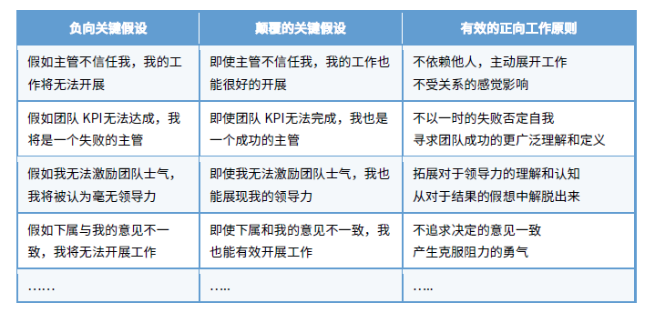 在我指导一个客户组织中的管理人员发现自我关键假设的过程中,我们总结了“表一”中的 内容。从中可以看到,正向的工作原则的产生往往是从颠覆自有的负向的关键假设开始的。 如一位管理者认为“假如主管不信任我,我的工作就无法开展”,而颠覆这样的关键假设就 会产生一种新的观念-“即使主管不信任我,我的工作也能很好的开展”。如果将这样颠覆的 关键假设用正向原则的语言表述,可以呈现为-“依赖他人,主动开展工作,不受关系的感 觉影响。”从心智的角度来审视,我们就可以看到这样的新原则让管理者从“关系导向”转 向了“业绩目标”导向,带来了心智上的提升。