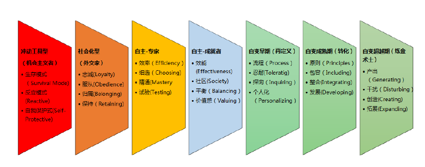 从价值观念的转变来看,任正非也体现了因为心智演化,而带来的领导者关注的价值点的持续提升和转变。我们可以清晰地看到他在青少年时期和创业早期的生存模式(Survival Mode);也可以看到他在大学从军到转业期间的主流价值认同和归属(Belonging)状态;他在从军期间通过技术创新获得国家科技大奖体现了他专家思维的精通(Mastery)模式;当他组织华为的人才实现华为业绩的突破体现了他关注效能(Effectiveness), 尝试平衡(Balancing) 不同业务单元的技巧和手段;在“甩手掌柜”工作模式下他体现了足够的耐心(Tolerating), 广泛参与组织内部探讨(Inquiring)和尝试置身事外的个人化色彩(Personalizing);而当他逐渐进入自变的转化模式时,我们能够看到他制定和传播原则(Principles),不断通过个人讲话梳理和宣传自己的工作理念, 也可以看到通过整合(Integrating)和发展(Developing)他逐渐将自己倡导的原则落实为创新的组织实践活动,推出落实了一系列助力华为腾飞的制度和举措,从而让华为一跃成为世界第一的电信巨头企业。而他的自变超越期(炼金术士)更加体现在他持续产出(Generating)自己独特的管理哲学思想,并尝试通过思想介入(Disturbing)华为的内部管理从而影响众人的思想塑造,他个人也逐渐演化为一名商业上的精神领袖。虽然他不愿意彰显自己的名声,但依然光芒四射,对中国的企业和社会产生了积极的精神影响。而这一历程,高度吻合了托伯特(Torbert)的学生赫德曼巴克(Herdman-Barker)博士提出的领导者行为逻辑下的价值观演化模型(见下图一)