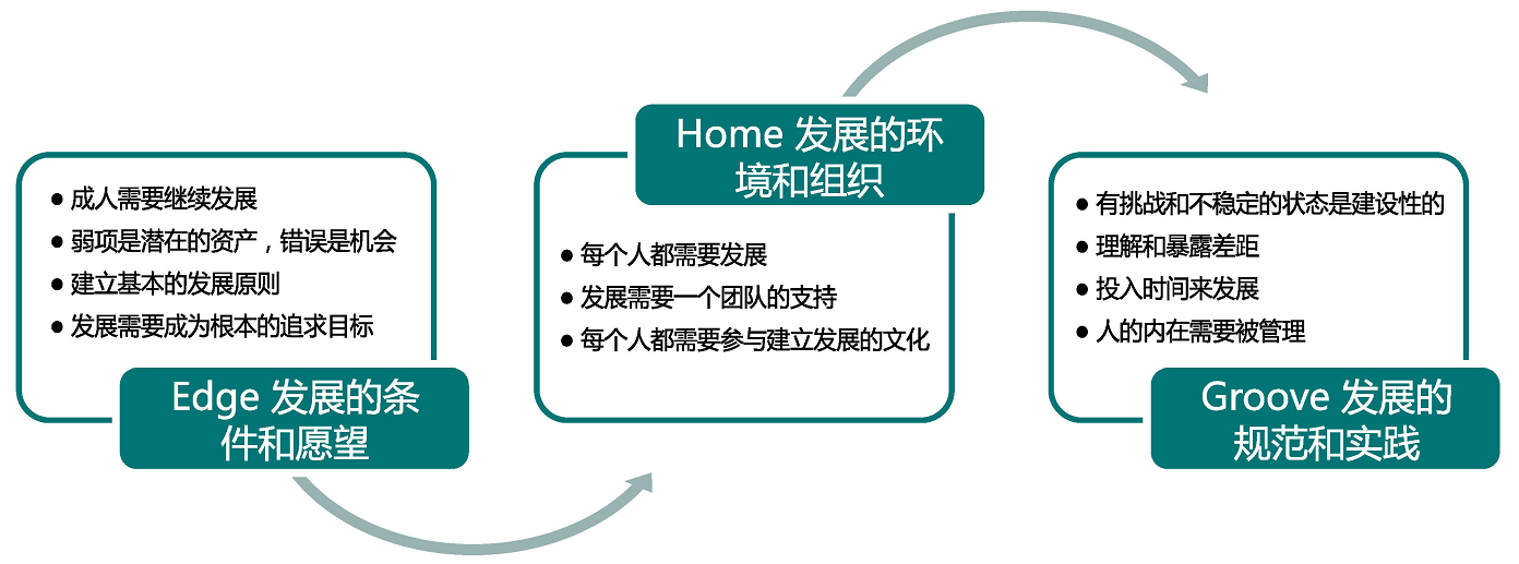 • 发展的规范(Groove):1.挑战和不稳定的状态才能带来发展;2.理解和暴露问题才有可能发展;3.发展可能花费很多中间,但会有足够回报;4.人的内在状态需要被关注。